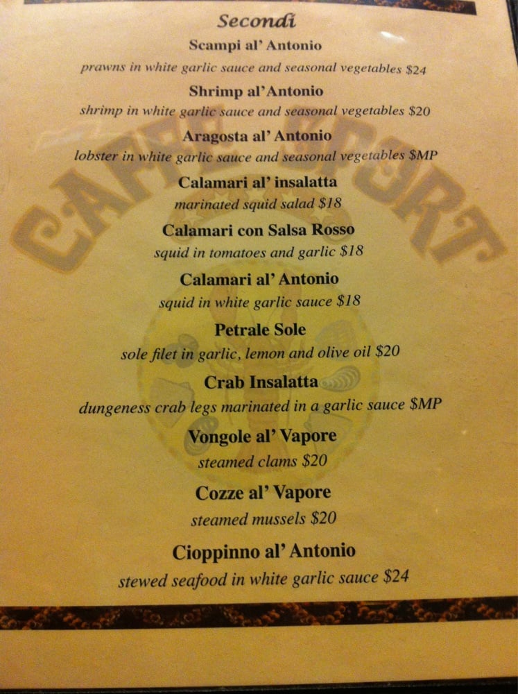 Dungeness crab legs, prince edward island mussels, manila clams, monterrey calamari and gulf shrimp steamed at the moment and covered with house recipe of lemon juice, minced garlic and olive oil.